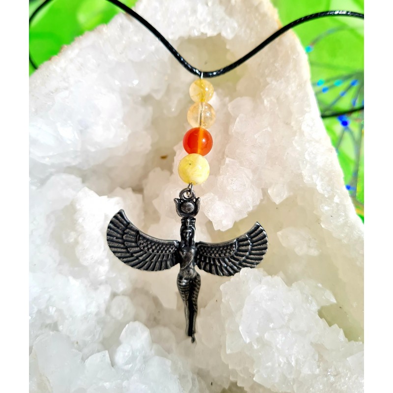 Un collier pour se reconnecter au féminin sacré avec l'aide de l'énergie de la merveilleuse Déesse Isis et ses perles de citrine, cornaline, opale jaune et quartz rutile.