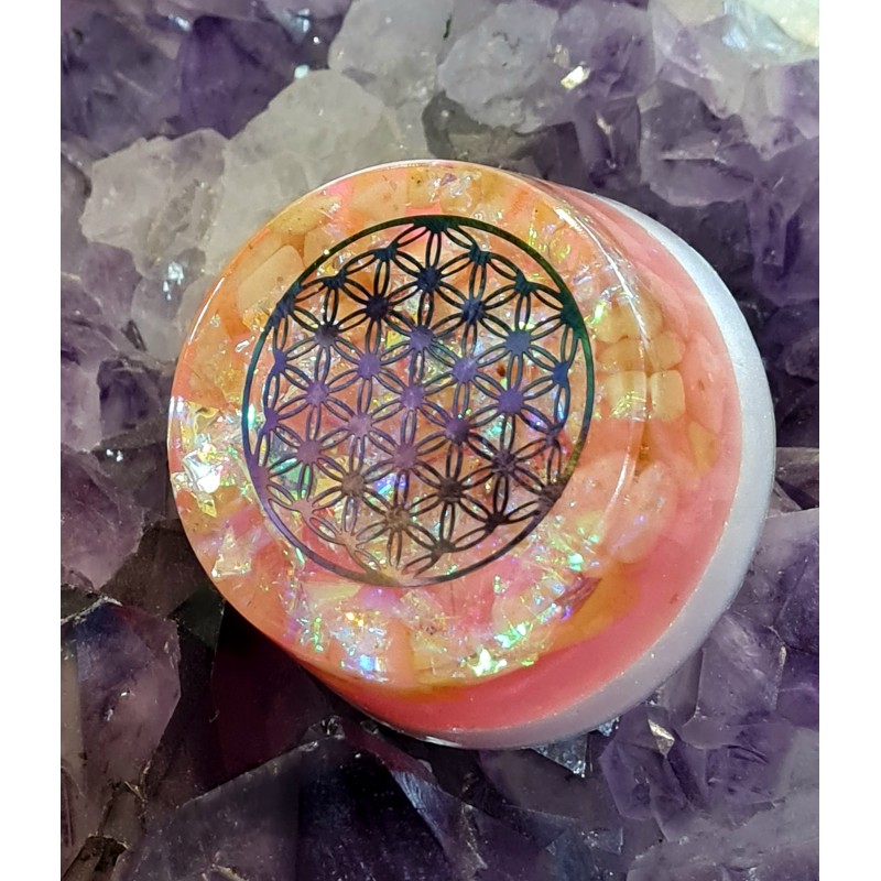 Orgonite galet avec sa Fleur de Vie, citrine, opale rose, jade