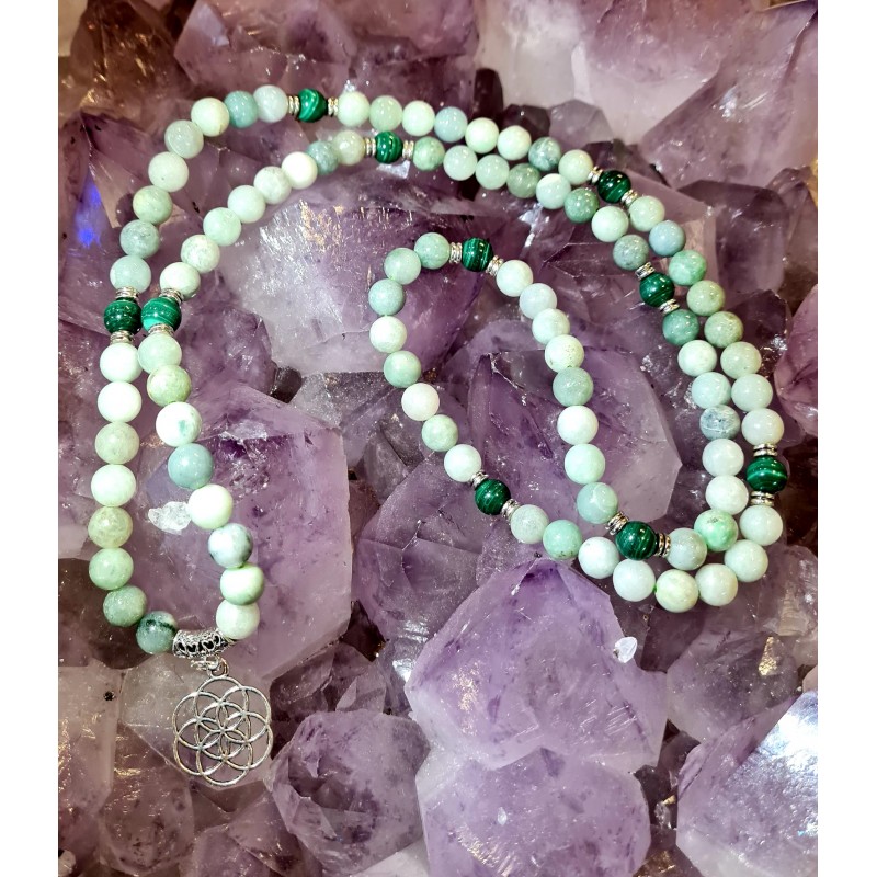 Un rayon vert de tendresse et de bien-être avec ce merveilleux mala en Jade de Birmanie et Malachite, complété par une graine de vie symbole de force de vie, de création, d'expansion et de fertilité dans son sens le plus global