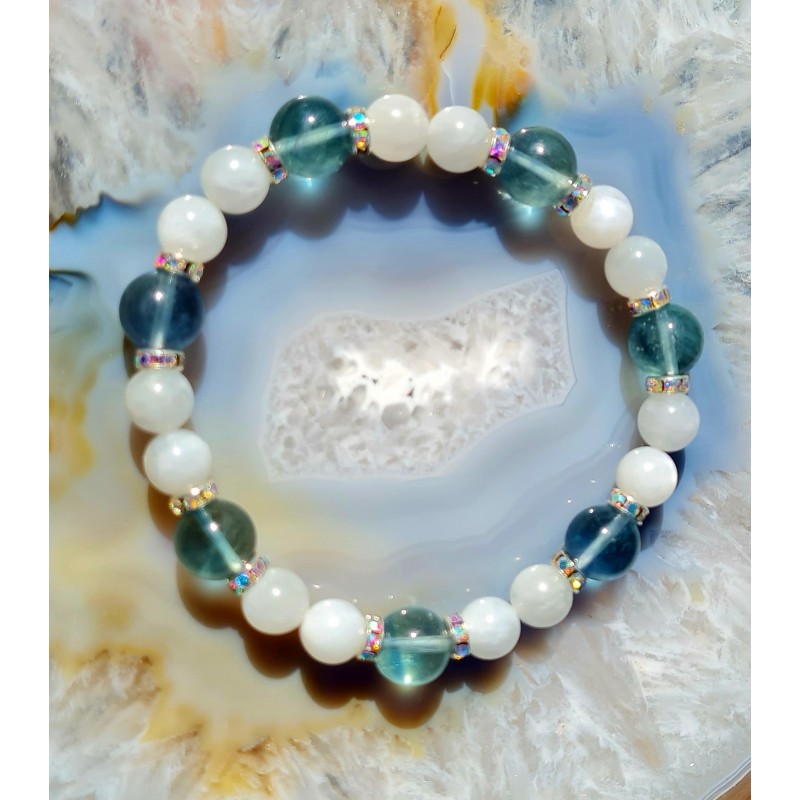 Un très joli bracelet lumineux composé de fluorite bleue et de labradorite blanche pour soutenir lors de l'éveil et du développement spirituel. Il vous permettra de développer et renforcer votre intuition avec beaucoup de calme, de sérénité et de confiance en vous et en vos ressentis.