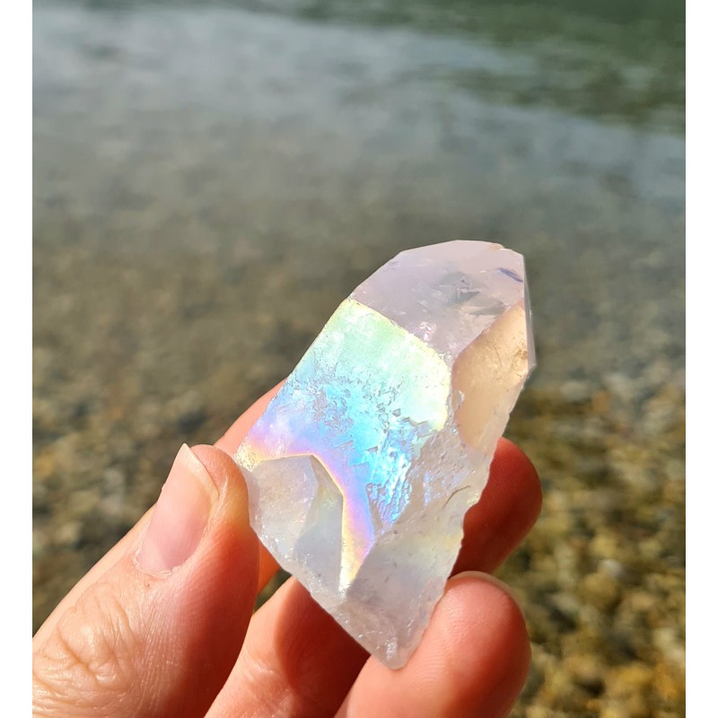 Enduit de platine, d'argent ou d'or et légèrement chauffé le Quartz Angel Aura élève son taux vibratoire.