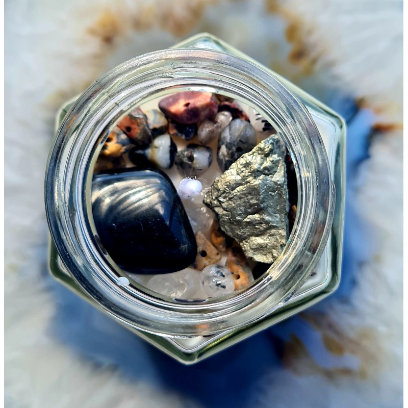Dans un premier temps, la cire de soja étant un excellent diffuseur énergétique, nous la programmons et la magnétisons grâce à des techniques de soins énergétiques. Et ceci pour chaque type de bougie en fonction des vertus que nous souhaitons lui attribuer pour vos différents vœux. Ainsi les minéraux que nous intégrons dans notre préparation sont différents suivant chaque thème.