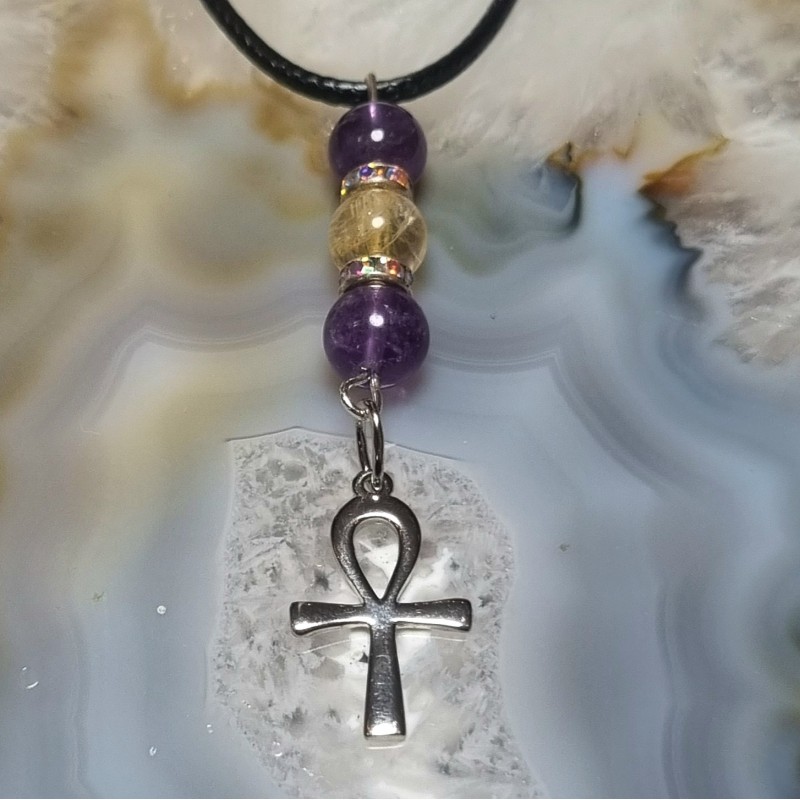 Joli collier confectionné artisanalement avec des minéraux véritables, sa croix de vie en argent 925 et son cordon à fermoir réglable.