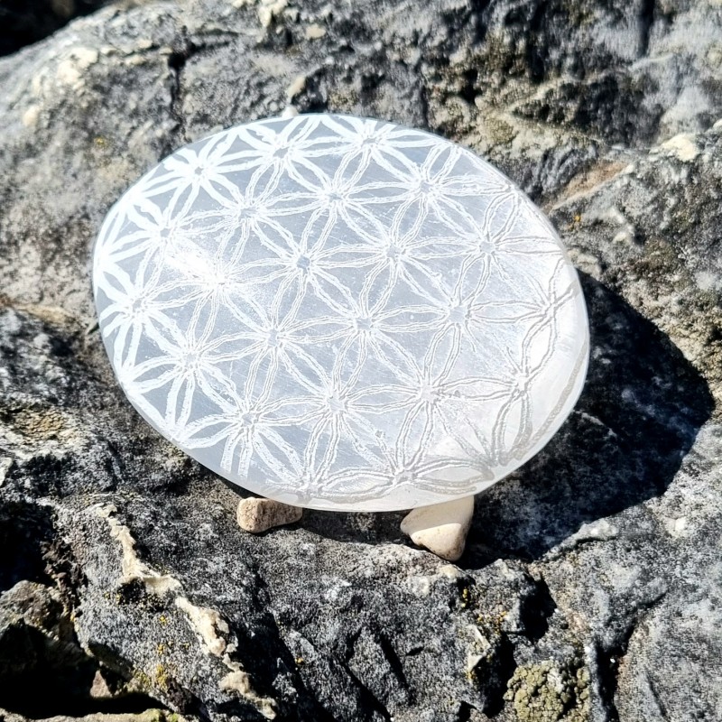 SELENITE : Elle possède une vibration très fine et fait partie des cristaux les plus puissants de la nouvelle vibration terrestre. Elle confère clarté d'esprit, ouvre les chakras couronne et transpersonnel, permet d'accéder à la conscience angélique et à la direction supérieure. La sélénite rattache au corps de lumière (véhicule de l'âme), l'aidant à s'ancrer dans la vibration terrestre. C'est ainsi un excellent cristal pour faire circuler en soi les énergies du Ciel et de la Terre et permettre une belle évolution énergétique et spirituelle. Pierre calme qui instille une paix profonde, excellente pour la méditation et le travail spirituel, développe la télépathie et l'intuition. Elle est également une belle pierre de protection et idéale pour le travail de libération des traumatismes des vies antérieures et pour celui qui permet de se rappeler de tous les potentiels acquis dans ces vies précédentes. Aide dans le présent à stabiliser et apaiser les émotions.