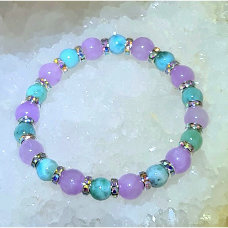 Sublime et rare bracelet de larimar et kunzite de très belle quialité. Permet à l’âme de s’épanouir et de se réjouir de toutes les beautés de la vie.