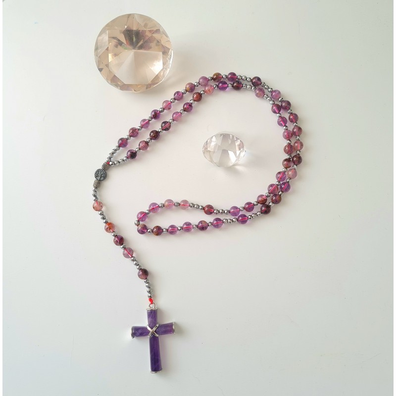 Chapelet en super seven avec sa croix en améthyste et ses intercalaires en hématite