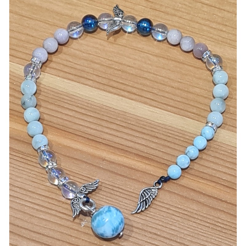 Sublime pendule qui connecte à l'énergie et la belle lumière des anges pour vos questionnements et la communication divine. Un sublime larimar en guise de pendule en forme de boule montée sur argent 925, des perles de kunzite, Angélite verte, aqua aura, Angel Aura, Hemmimorphite le composent.