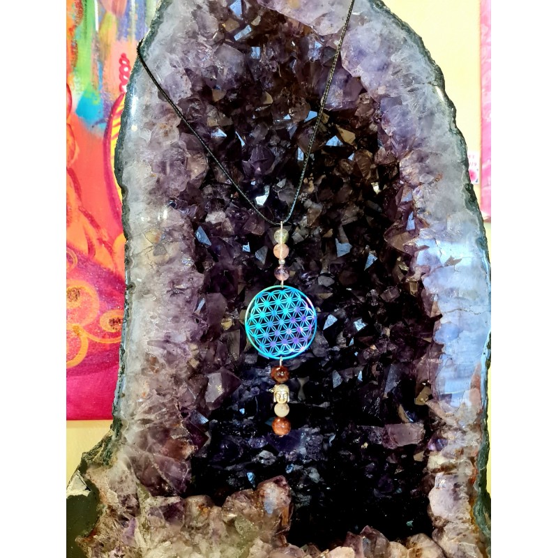 Collier avec sa magnifique Fleur de Vie holographique en métal et ses perles de super seven et de lodolite ainsi que son bouddha.