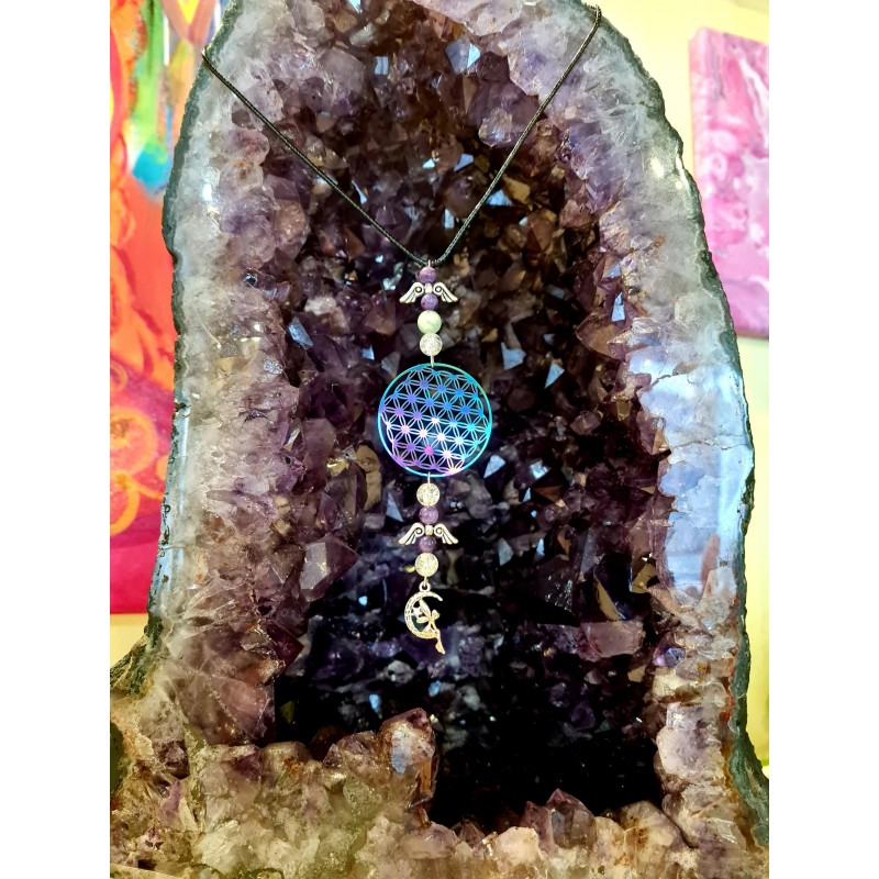 Collier avec sa magnifique Fleur de Vie holographique en métal et ses perles de cristal de roche, de charoïte, d'angélite verte, ses ailes d'ange et sa jolie fée.