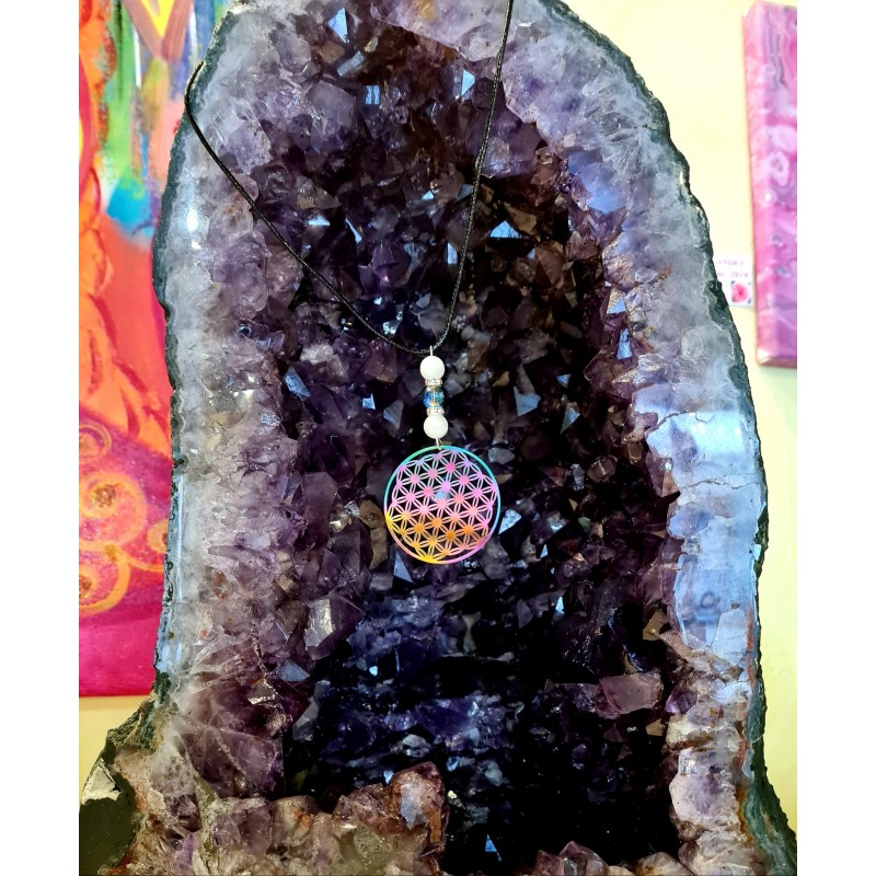 Collier avec sa magnifique Fleur de Vie holographique en métal et ses perles de célestine et d'aqua aura, excellentes pierres d'intuition, de communication divine et de développement spirituel.
